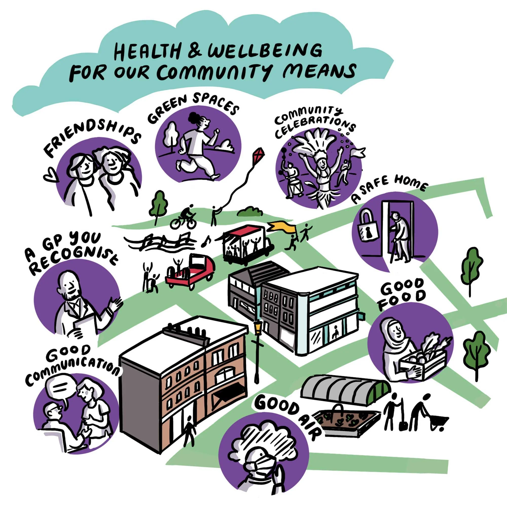 I joined live workshops with council teams, NHS staff and local residents — listening, sketching and turning conversations into visuals as they happened.