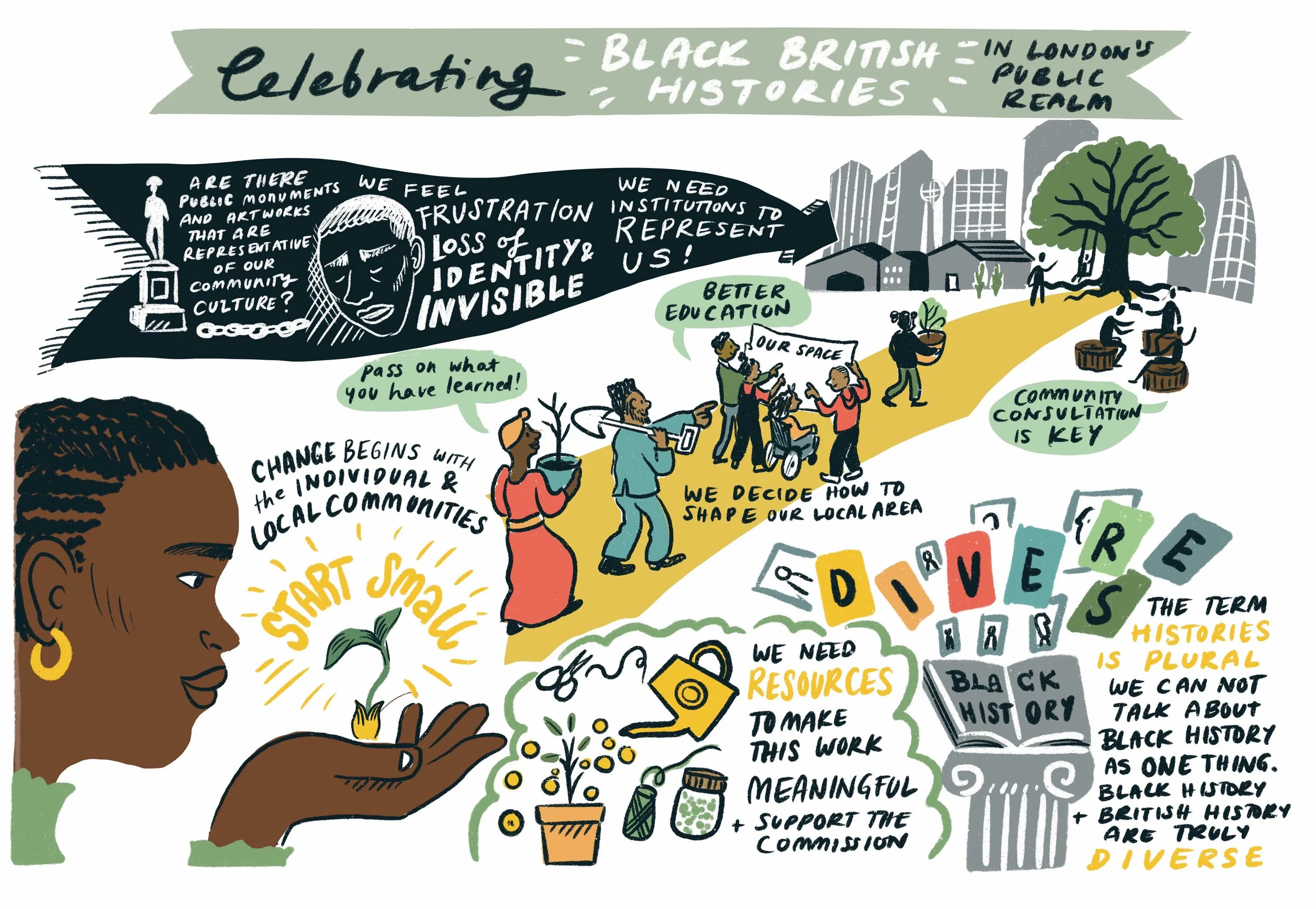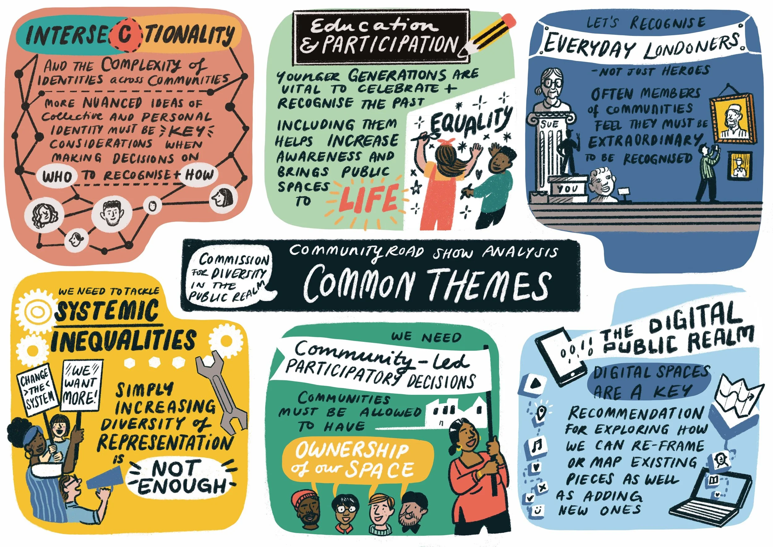I was commissioned by the London Mayor’s Commission for Diversity in the Public Realm to create a series of works responding to insights gathered by over 400 Londoners. The illustrations celebrate the diverse experiences of London communities and histories.