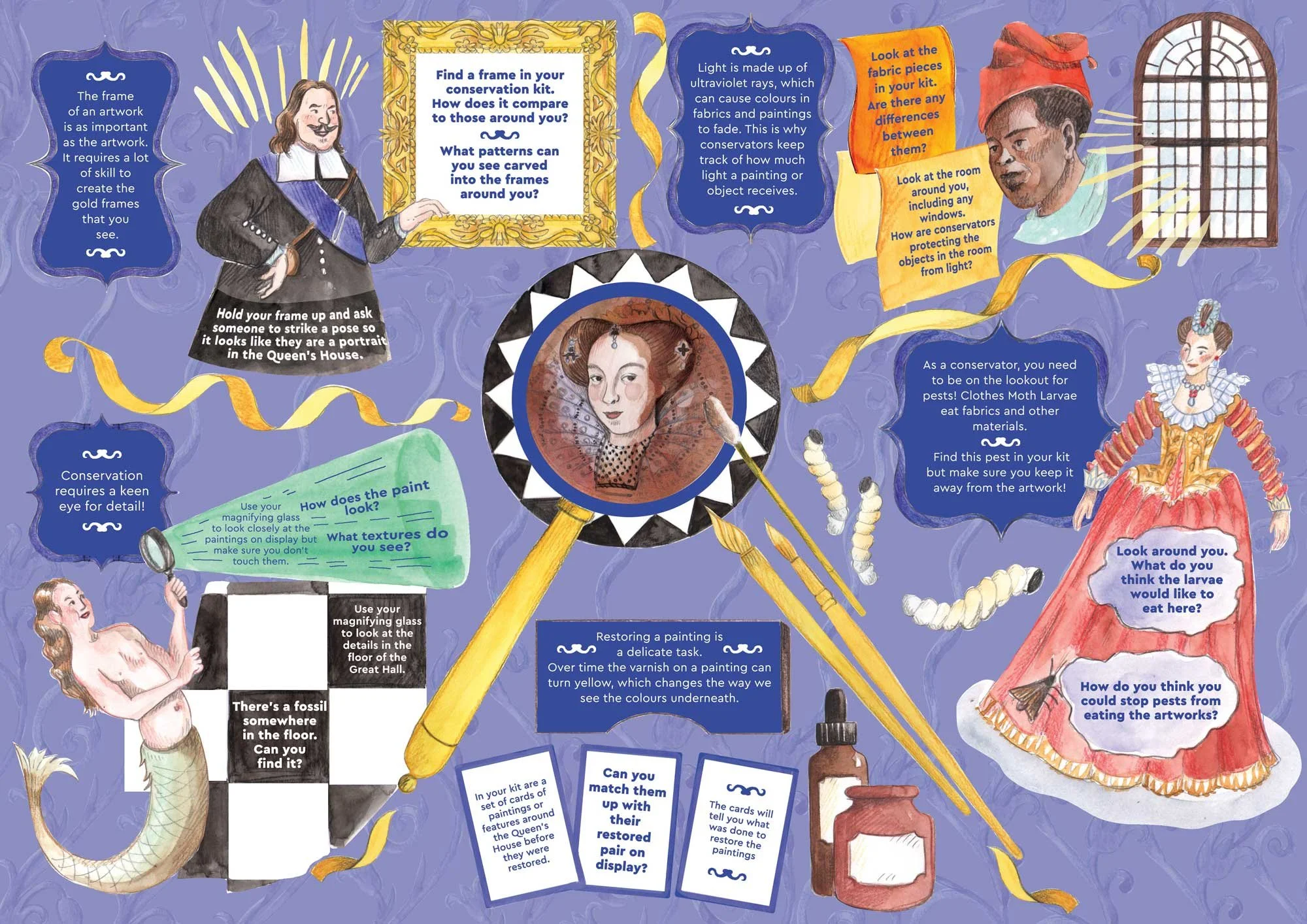 Commissioned by Royal Museums Greenwich, I designed an illustrated activity trail for children visiting the historic Queen’s House. The project took the form of an A2 folded poster, guiding young visitors through the space with playful prompts and engaging visuals to help them explore the building and discover its rich history in an interactive way.